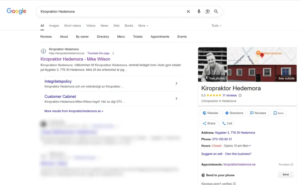 - Nummer 1-placeringar i Hedemora: Kliniken uppnådde nummer 1-position i Hedemora för de viktigaste kommersiella sökorden som “Kiropraktor Hedemora” i både organisk sökning och Google Maps.